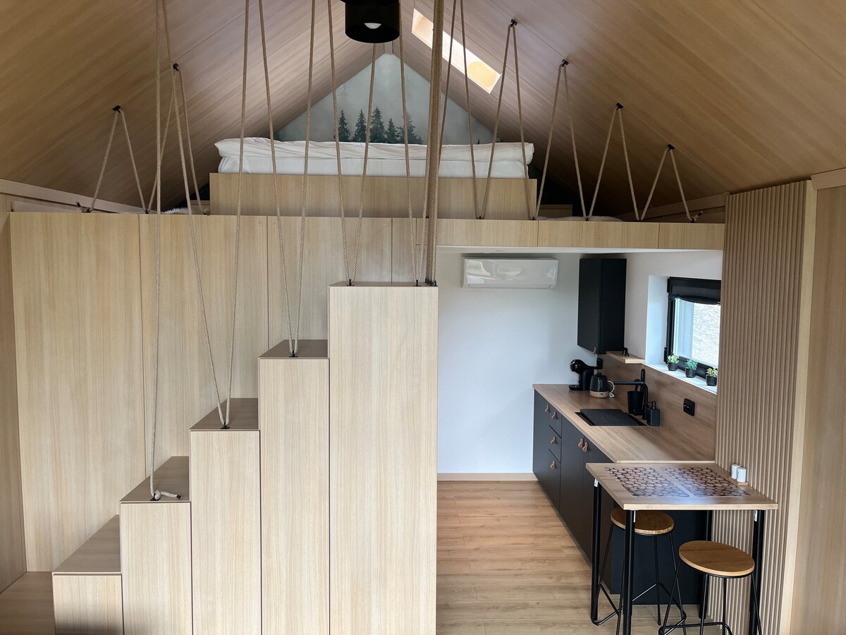 Descopera un tiny house unic, creat pentru intimitate si relaxare. Spatiul este gestionat foarte eficient, iar interiorul este creat manual, cu materiale reciclate. Casa este incalzita automatizat, cu peleti din lemn si flacara adevarata. La etaj veti descoperi toaleta si cabina de dus separata. Atentie la cele trei trepte verticale, acestea pot fi dificile pentru persoanele cu mobilitate redusa! Va rugam sa nu folosit aparate electrice cu putere mai mare de 1000W! Casa este adult-only.