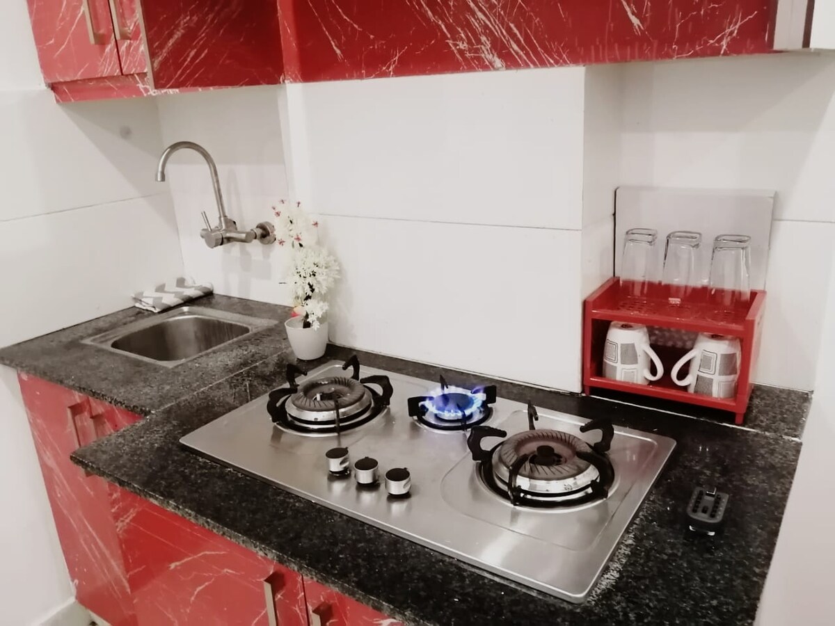 Discover our cozy one-bedroom apartment, perfectly located in the heart of Islamabad. Ideal for Families, couples, solo travelers, or business professionals, this stylish space offers comfort and convenience for your stay. ► Modern interiors: spacious bedroom, sleek kitchen, cozy living area. ► Building features Coffee Beans & Brim – dine-in or takeaway!. ► Amenities:High Speed Wi-fi, Free Parking, garden, 24/7 security. ► Family-friendly, centrally located – everything at your doorstep
