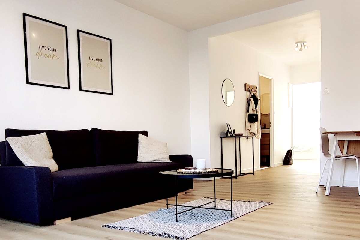 Modern apartment, completely refurbished, located on Reunion Square in Mulhouse. Ideal for 4 people, it has one bedroom with double bed, sofa bed, equipped kitchen, living room, bathroom and terrace. Quiet and bright apartment, close to transport (train station 5 minutes away), restaurants, museums and shops. Direct access to the Christmas market in winter. WiFi, NETFLIX TV and bedding included. Perfect for families or couples. Book now!