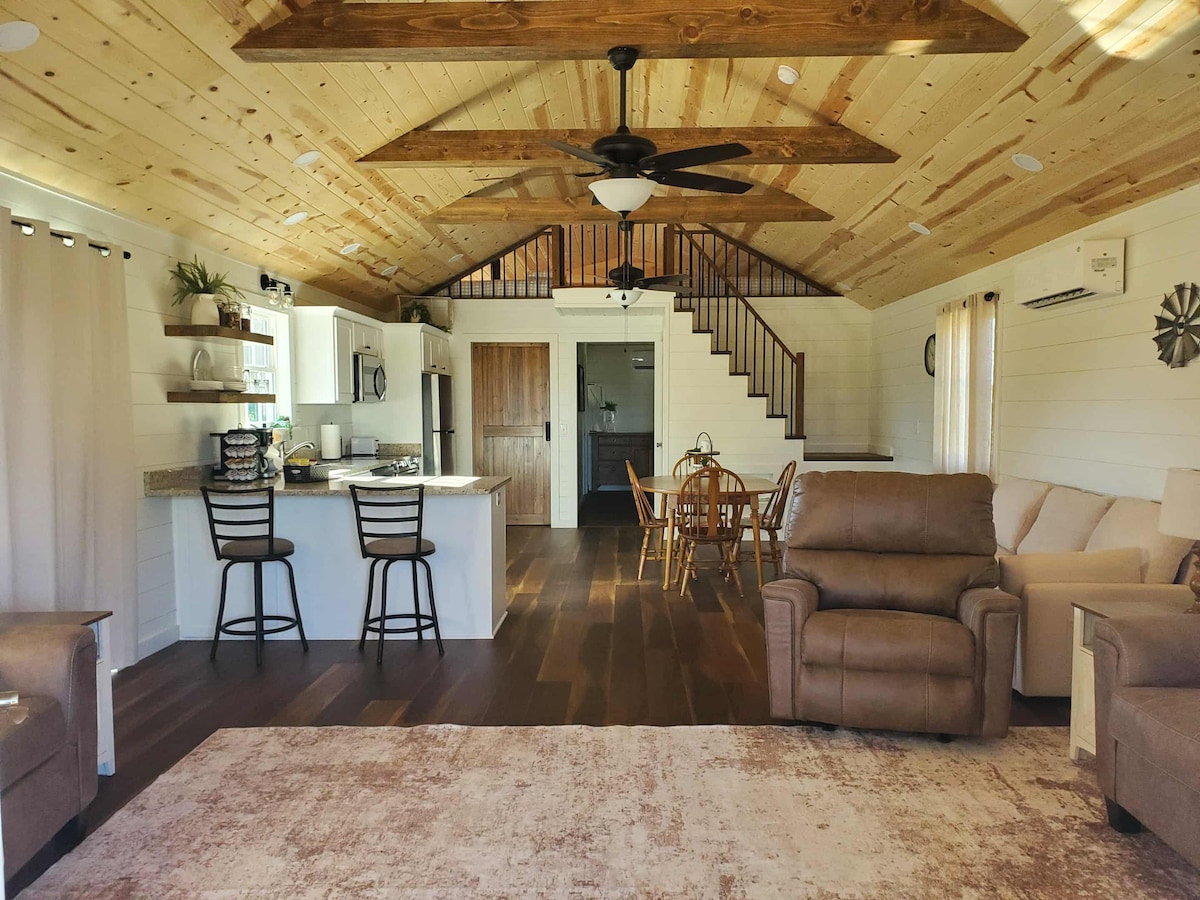You’ll treasure your memorable getaway at this unique Tiny House on the Prairie. This brand new cabin in the country includes a full kitchen, full bath, one queen size bedroom on the main floor, and three beds - one queen and two twin - in the open loft area. This romantic loft has a 4 ft. ceiling in the middle with dormers on both sides. There's also a queen size sleeper sofa in the living room on the main floor. Spend time taking in the country air on our large front porch.