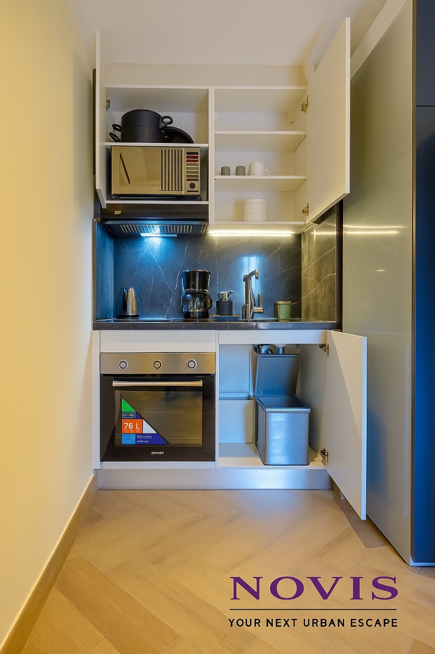 Spacious serviced studio with a large sleeping area and a private balcony overlooking the garden. The studio includes a comfortable bed, a sofa bed for an extra guest, a modern bathroom, and a cozy seating area. Bright interiors and warm lighting create a calm and welcoming atmosphere. Perfect for couples or solo travelers seeking comfort, privacy, and a peaceful stay close to nature.