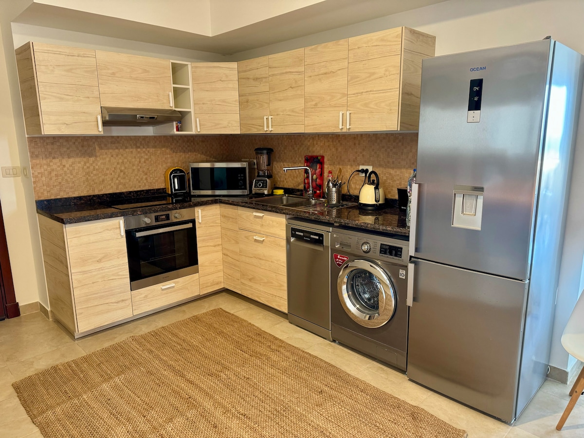 Stylish 2-bedroom apartment in the heart of El Gouna. The beautiful pool is located directly within the complex, just steps away, and the private beach and lagoon are only an 6-minute walk. Perfect for a relaxed stay with family, friends or as a couple. *The space* 2 bedrooms 2 bathrooms Private balcony Fully equipped kitchen A/C in all rooms De’Longhi espresso machine Washing machine Fast Wi-Fi Safe Smart TV with streaming options Close to Marina, Downtown & Kafr Quiet and green surroundings