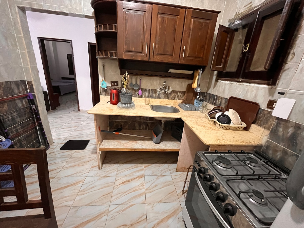 The apartment is conveniently located near the Medinet Habu temple and within a village. It comprises two rooms: the Anubis Room, featuring a king-size bed (160 cm) accommodating two people, and an en-suite bathroom; and the Tutankhamun Room, which includes two single beds and a balcony with a sunset view. Unlike the Anubis Room, the Tutankhamun Room has its own bathroom, which is located nearby. The apartment also includes a living room and a fully equipped kitchen.