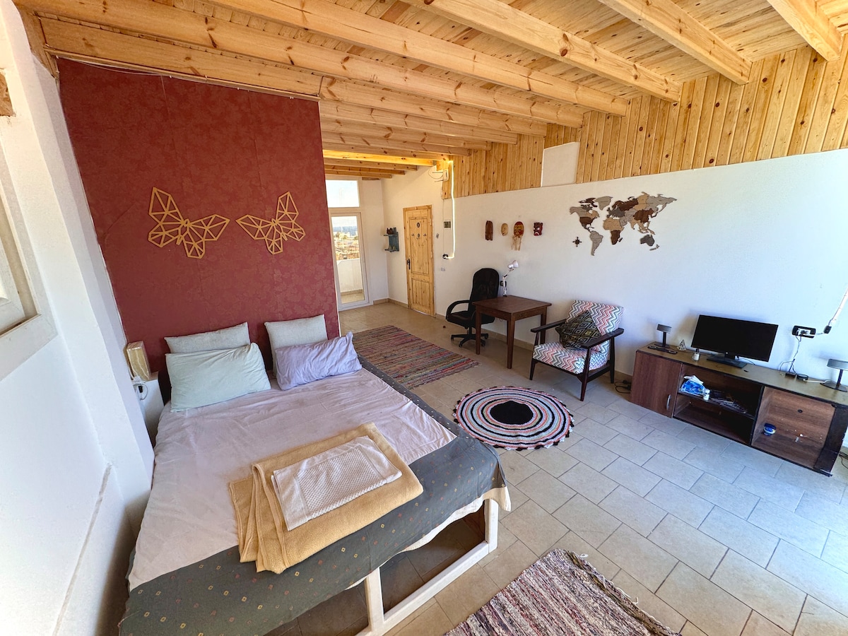 Located on our rooftop, we proudly present a stunning, super-bright and panoramic 40m² studio. Fully air-conditioned, it features a fully-equipped kitchen, a comfortable 160cm bed, a dining/work table with a computer chair, a flat-screen TV and a high-quality BOSE sound system. Enjoy breathtaking views from the private terrace overlooking the mountains and the seaside from the private balcony. Our building, DAHAB WORLD, is situated in the heart of Asala center, & just 5-minute walk from the sea.