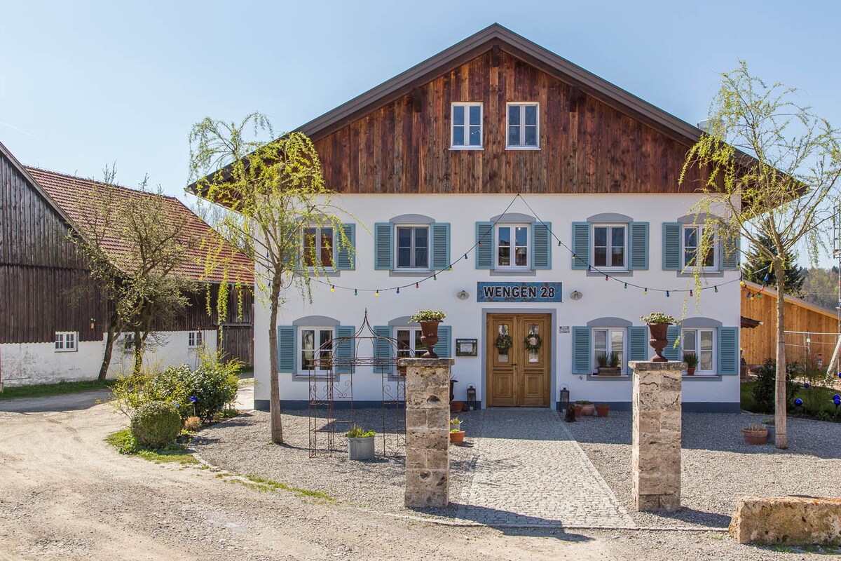 Die Hofstelle in ländlicher Alleinlage bietet eine ca. 60 qm große Einliegerwohnung mit allem Komfort für einen erholsamen Urlaub. Bei einem Frühstück auf dem Balkon können Sie Energie in der Morgensonne tanken. Genießen Sie dabei die frische Luft , den herrlichen Blick auf das Kloster Andechs und die unverbaute Umgebung. Die sonnige Terrasse am Bach und der Grillplatz laden nach einem ereignisreichen Tag zum rasten und relaxen ein.