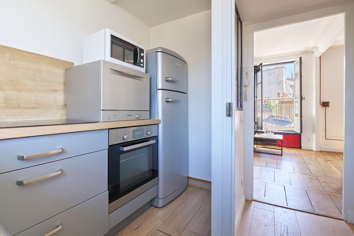 Charming apartment located in an old townhouse, nestled in a quiet residential neighborhood. Tucked under the roof (on the 3rd floor without an elevator), it features all amenities (bathroom, toilet, kitchenette) and a private entrance. Bathed in natural light, this bright and soothing space offers a warm and welcoming atmosphere, with comfortable furniture, harmonious tones, and is child-friendly.