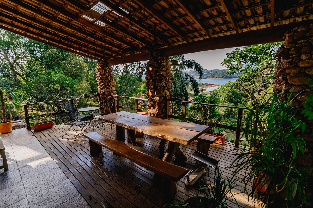 Cabin with jacuzzi and infinite view of the dam, ideal for relaxing in the midst of nature with total privacy and security. Perfect for couples, it offers a deck with stunning views, incredible sunsets and starry skies. Enjoy the birdsong and tranquility upon waking. Located in a nautical marina with restaurant and motorboat, kayak and quad bike tours just 1h30 from São Paulo, with paved access by the Dom Pedro I Highway. Wi-Fi, full kitchen, air conditioning