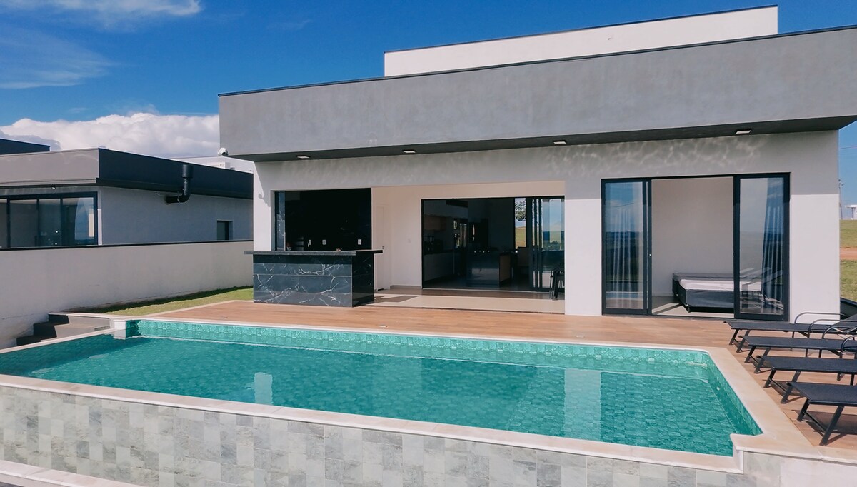 Cinematic leisure house in a gated community (Riviera de Santa Cristina I) facing the Avaré dam - SP. Swimming Pool Wide outdoor area Gourmet barbecue grill 05 en-suites with air conditioning 01 TV room with 4 sofa beds Kitchen External Internal Kitchen Living area 07 bathrooms Sinuca Table Ping-pong table Foosball Table Wifi (Speed 300Mbps) Vacancies identified at the entrance of the property *Maid service available separately.* For New Year's Eve and Christmas Insta: Soleil_casa