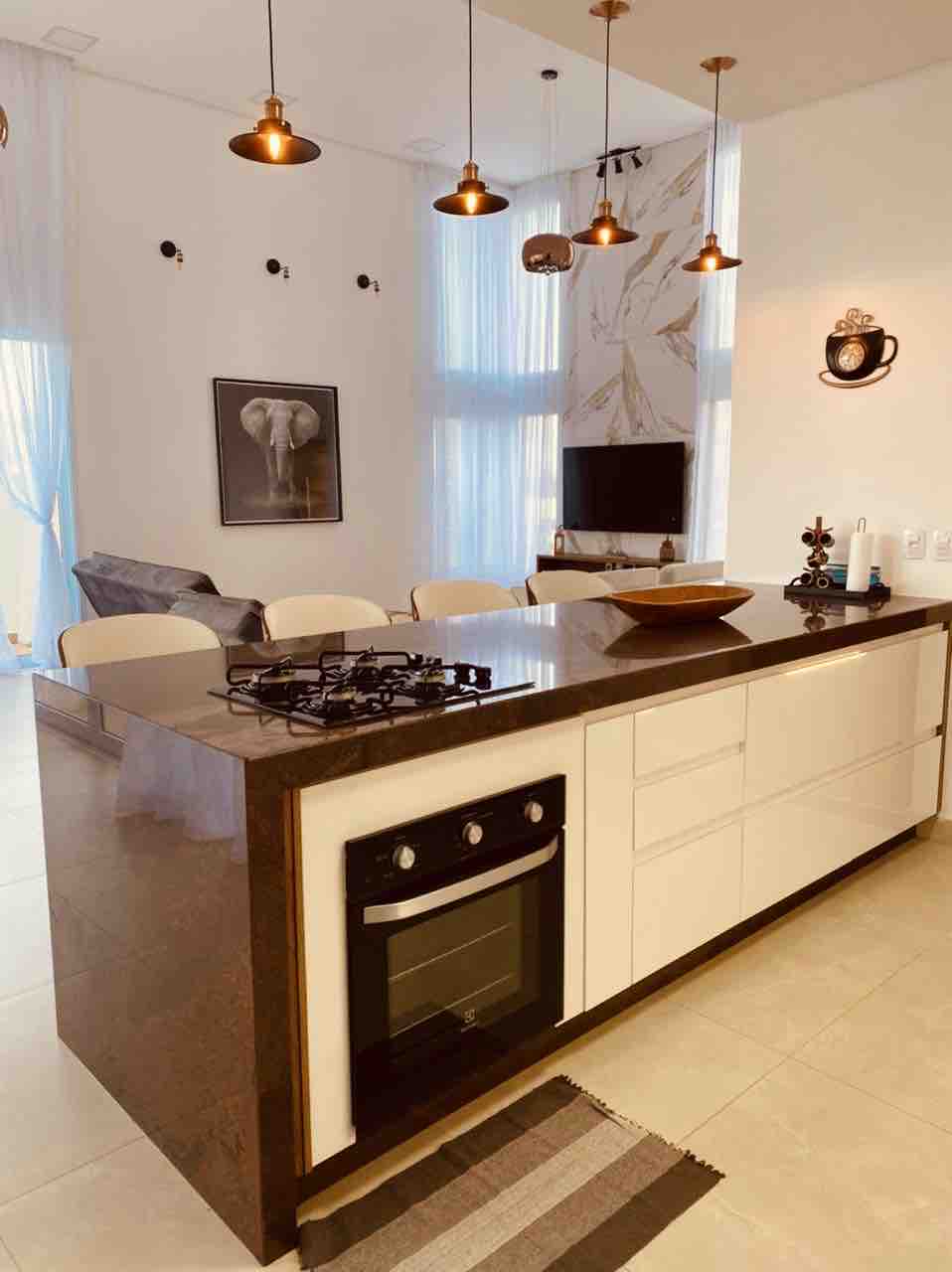 Beautiful townhouse in Riviera de Santa Cristina XIII, in the Yacht sector, the best location in the development. Air conditioning in all rooms . Planned with double-height and 300m2 of area with pool integrated into the gourmet space Portãozinhos on the sides for pet Laundry room with washer-dryer Mini market – self-checkout Fibre internet Tela Protection TV Various Channels Alexa in the gourmet area Security cameras and alarm system 300m from Casa do Lago Lakes and Sunset View
