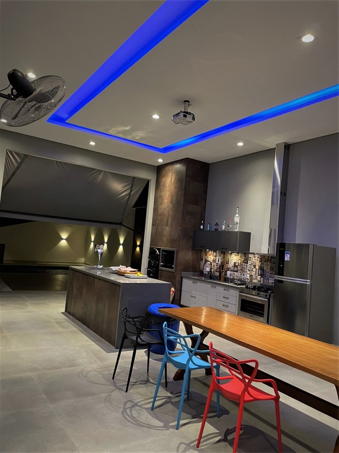 New house, ground floor, in Cond. Riviera de Santa Cristina XIII condominium. 4 EN-SUITES all with air-conditioning, 1 lavatory, laundry room, living-dining room-kitchen combined in a large single space of approx. 50 m² of free span with a ceiling height of 5.5 meters. GOURMET area: Beer cooler, Barbecue, Wood-burning Oven, Stove with Gas Oven, Refrigerator, Brewery, Projector and Bluetooth Speaker, Table, Retractable Awnings and External Bathroom. Swimming pool with beach, heated (Plates and Heat Exchanger) and sun loungers.