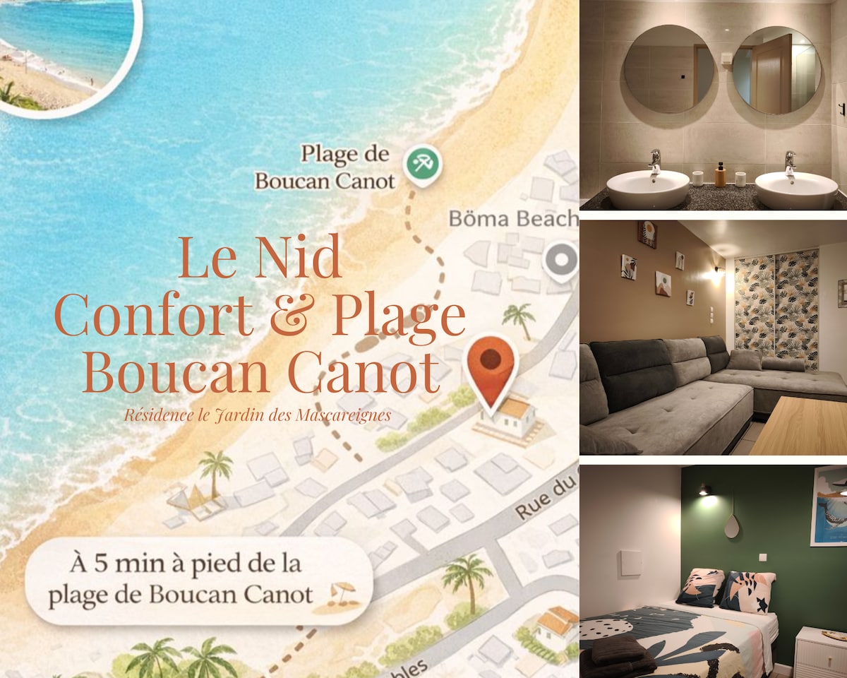 2-room apartment of 44 m² + terrace, in open space classified 3*** with large kitchen, living room with TV, Italian shower. Le Letchi in Boucan Canot welcomes you for short or long quiet stay, view of the tropical vegetation, 500 m from one of the most beautiful beaches on the island, ideal for 4 adults or couples with 1 or 2 children. Secure parking. Supervised and secure beach and large natural seawater pool. Privileged location to visit the island. Extra crib contact us.