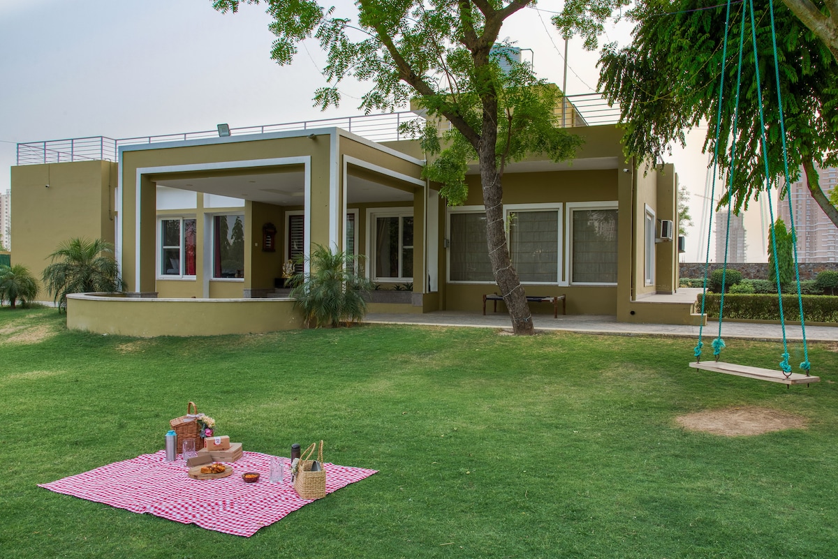 âLocated on the outskirts of Gurgaon, in Manesar. âSpacious 4-bedroom farmhouse ideal for up to 12 guests. âPrivate pool for refreshing dips. âGazebo for relaxed outdoor lounging. âTerrace perfect for gatherings. âChic bar setup for evening fun. âSpacious living hall with cosy seating. âHuge garden for cricket, badminton & football. âPerfect for a peaceful yet fun farmhouse getaway.