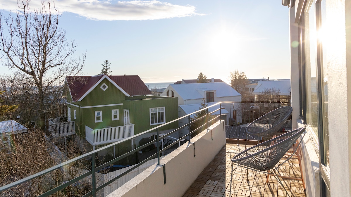 A flat with great views over the sea and the Reykjanes Geopark with its volcanos and mountain ranges. We are located in the established West quarter of Reykjavik (Vesturbær). In the neighborhood you will find Vesturbær thermal pool, the bistro "Kaffihús Vesturbæjar", "Brauð & Co." bakery, and grocery stores. 10-15 min walk to the city center Fully equipped kitchen. Located in a sought-after neighborhood of Reykjavík. Experience Reykjavík like a local.