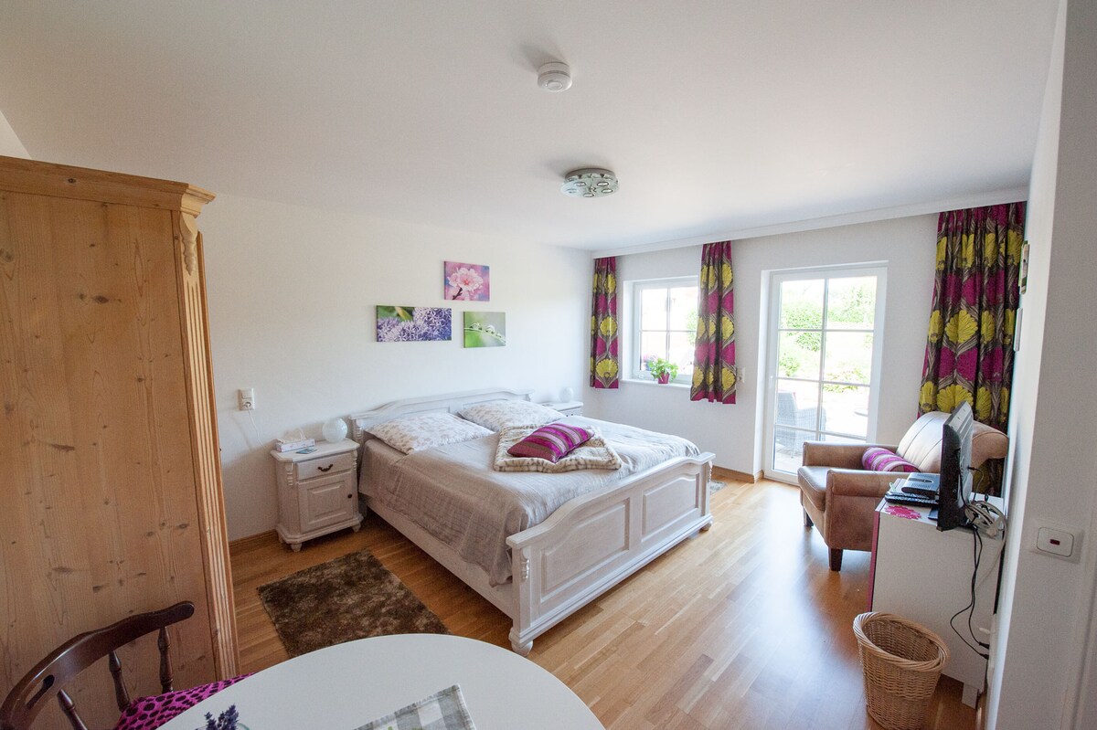Our newly renovated, large apartment is part of a historic square courtyard. On the upper floor there is a large, cozy kitchen-living room with great views and a fireplace, merging into an open living room, as well as two spacious bedrooms, each with a double bed (1.80 x 2.00 m) and a wardrobe. On the first floor there is a small bedroom with a double bed and a large bathroom with a bathtub and shower. It includes a parking space and a private, fenced garden.