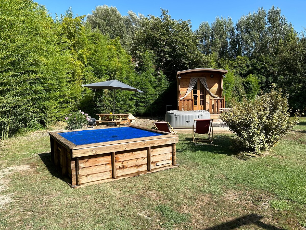 Beautiful caravan, jacuzzi and pool surrounded by nature