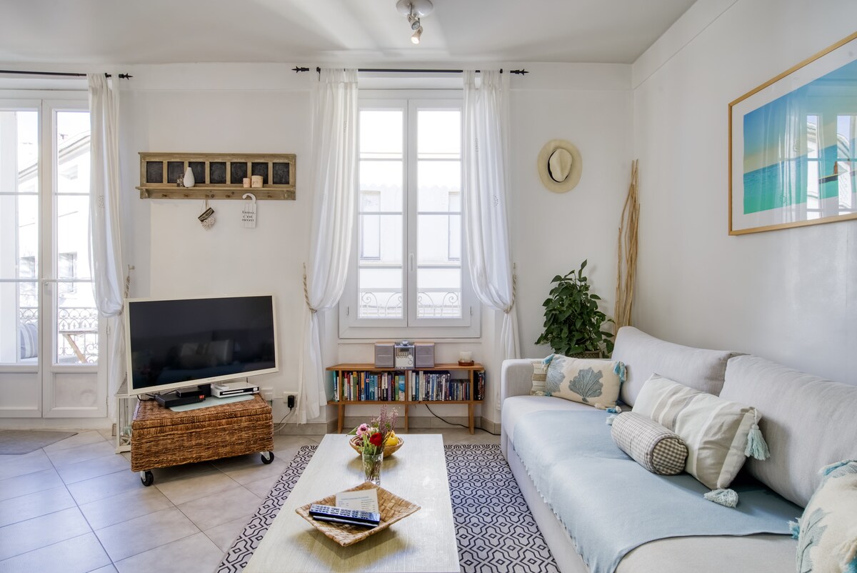 The apartment is in the center of the old town on a pedestrian street a couple of minutes to the famous Provencal Market, with a choice of beaches nearby. It's tastefully decorated in calm neutral colours, has lovely beamed ceilings, and is air-conditioned This is a lovely light and airy apartment in a perfect position to spend a very happy holiday. Convenient self entry with the KeyLock.