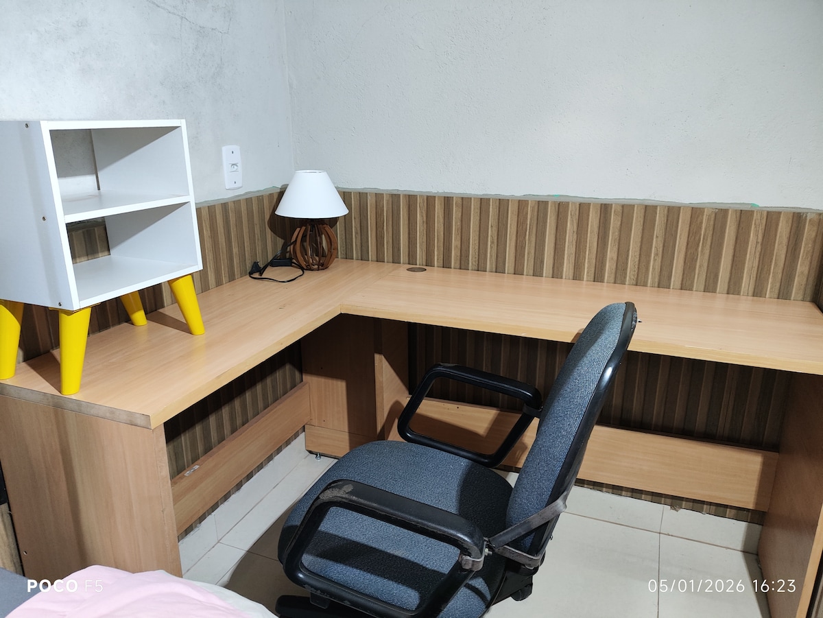 Charming and exclusive, combined living room/bedroom with kitchen, bathroom and balcony. Modern finish in tiles, porcelain and a privileged location in the heart of Jd. Paulista. The kit is on the first floor of a family residence, totally independent, access with a flight of stairs, balcony overlooking the street, equipped with air-conditioning, refrigerator, stove and complete in kitchen utensils, closet, fan, smart TV, double bed and third guest accommodation on an extra mattress.