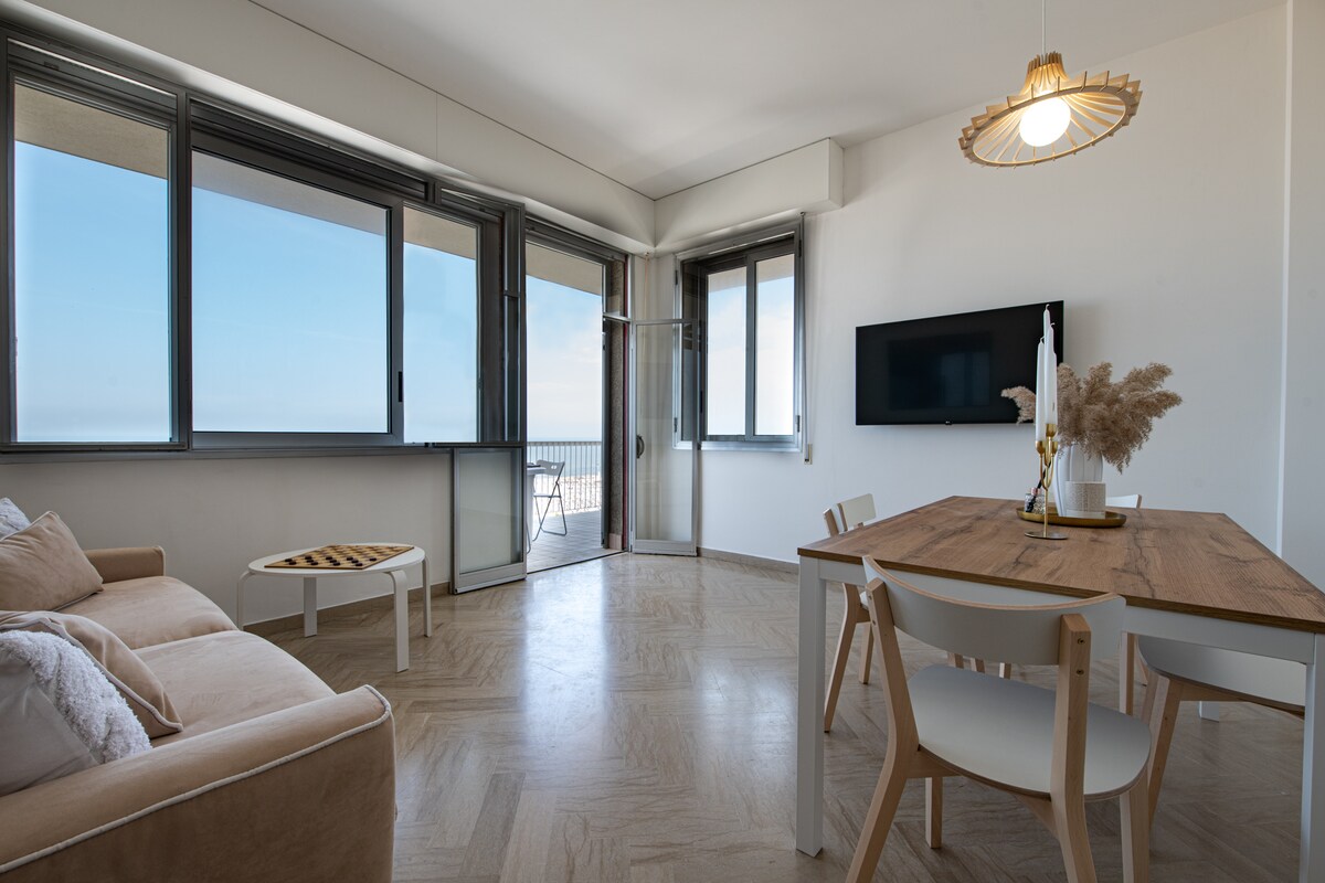 Apartment with stunning sea view, newly renovated on Rimini's seafront, just 10 m from the beach. Elegant living area, bedroom with King Size bed, kitchen equipped with hob, dishes, cutlery, pots, fridge and dining table. Independent air conditioning in living room and bedroom, electric shutters, ultra-fast fiber Wi-Fi, Smart TV in every room, desk, safe, large bathroom with window, hydromassage shower box, Bluetooth mirror for music and hairdryer.