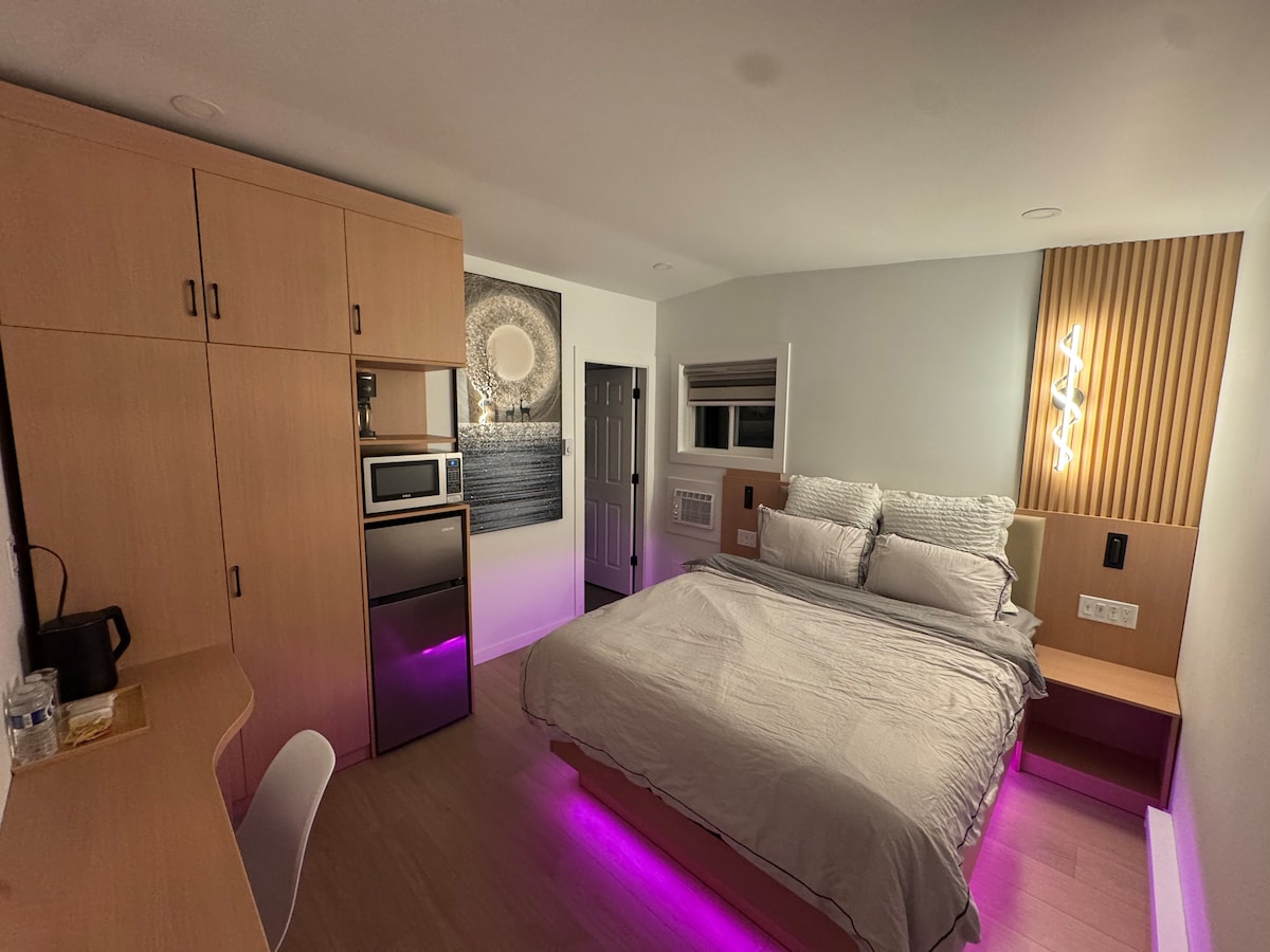 Welcome to Our Cozy and Clean Suite! I take pride in keeping the space exceptionally clean and tidy. The room is designed to be warm and comfortable. Weâve prepared all the essentials for your stay, including basic kitchenware, a microwave, a refrigerator, and a washer-dryer combo. The room also offers free high-speed Wi-Fi and complimentary Netflix access. Additionally, we provide free coffee and tea for you to enjoy during your stay.