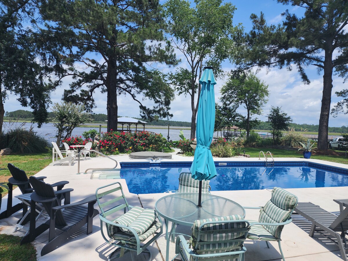 Paradise, Rest Relaxation, private, Snowbirds, Adventurers, romantic and small group getaways. A short 35 min distance from cultural and historic destinations in Savannah. Come fall in love with this secluded, quiet island retreat with newly redone pool, hot tub, screen porch. Deep Water Dock, floating dock, moorage, boat launch 1/2 mile away. Start your day with rose colored sunrises and end your day with red splashed sunsets across expansive river and marsh views. Birds, dolphins, fishing