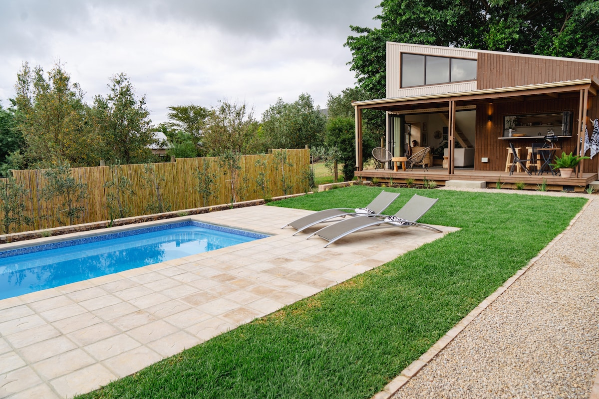 Enjoy the sounds of nature when you stay in this unique place. The sound of happy froggies, birds, chickens and horses will keep you grounded and takes you right back into what Nature had intended for us. This is a cozy tiny home container is indeed a tiny home, with a tiny kitchenette, two plate gas top and tiny fridge. It's nestled on a large plot, next to a lemon tree and rose garden. Our living eco pool hosts frogs and tadpoles which invites nature lovers for a cool down on hot days.