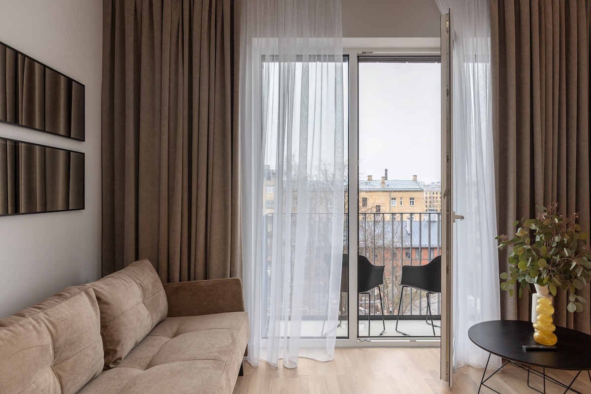This unique place has a style all its own! 1-bedroom apartment located in the centre of Metropolis on vast landscaped Philosophers' Residence terraces, its guests can dedicate themselves to thoughts and contemplations on the most spectacular Old Town landscapes of church broach spires of Riga Castle. From the viewpoints appears river Daugava beneath the Vansu Bridge crossing it, low-rise Kipsala and Pardaugava with its miniature houses sinking into green gardens.