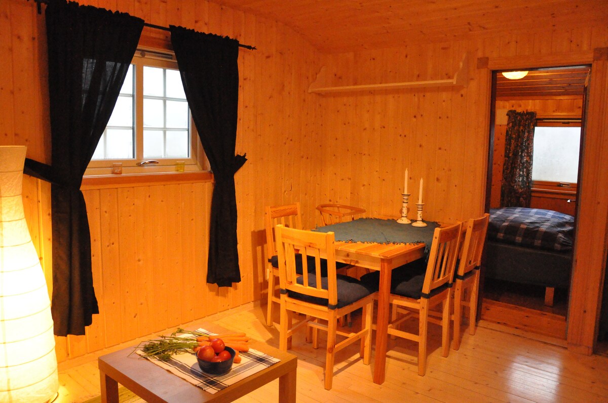 Our garden house has a plain Norwegian cabin standard with everything you need for making simple meals. Some basic food supplies will be available. As we have no running water in the garden house, we have placed a water dispenser in the kitchen area. Your bathroom, with floor heating and shower, is situated right next door, in the main house. The garden house has its own terrace, with access to the garden.