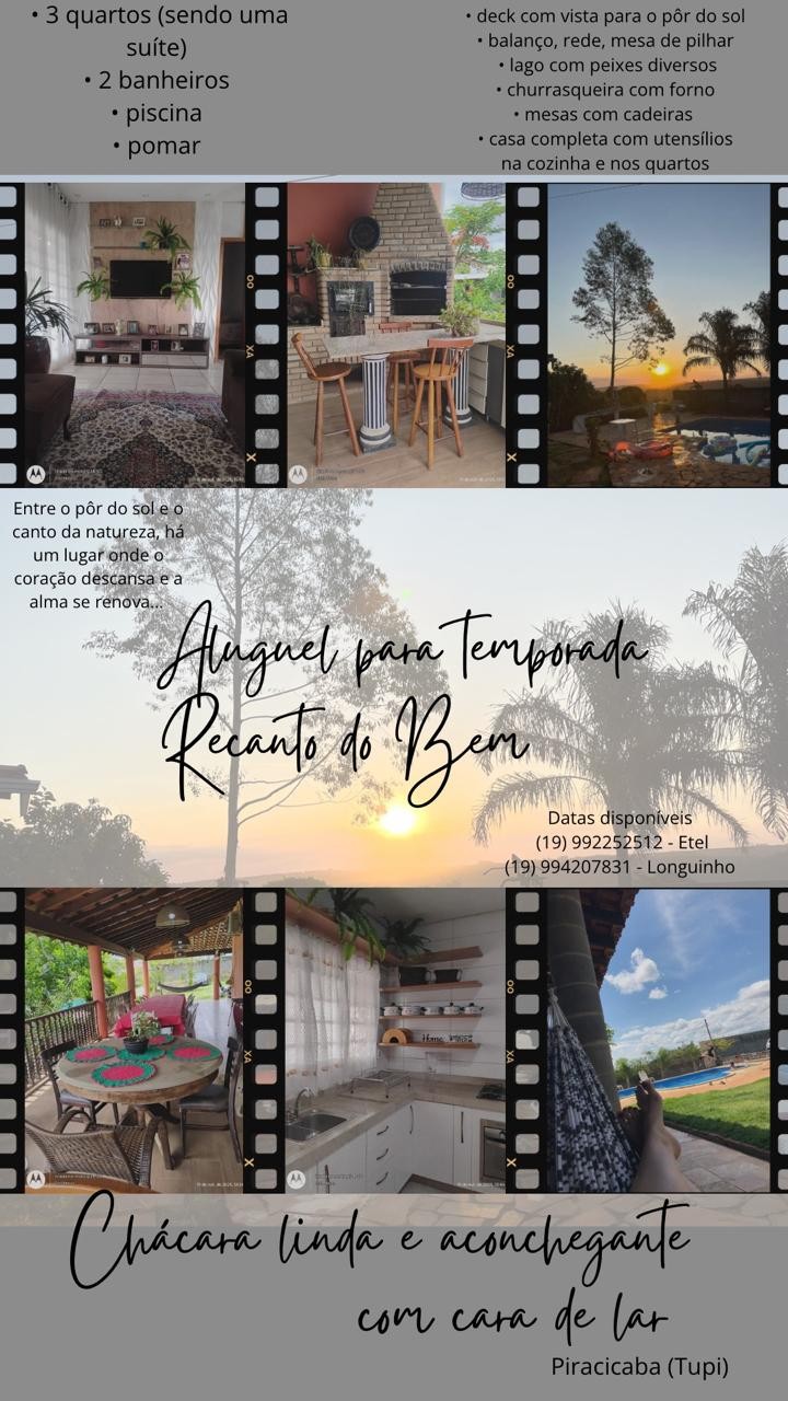🌴Local perfeito para reunir amigos e familiares com muita diversão! 🎉 ✨ Espaço para churrasco, fogão a lenha, área coberta para jogos e celebrar seu aniversário 🎂 em grande estilo! 🎉 ✨ Que tal passar um final de semana em um ambiente encantador? ✨ Ambiente ideal para descansar e ter paz junto à natureza e animais. 🌴 ✨ Aqui, você estará rodeado por muita natureza, longe da correria da cidade, em um ambiente que combina com diversão. Localizado no Distrito de Tupi próximo à Piracicaba.