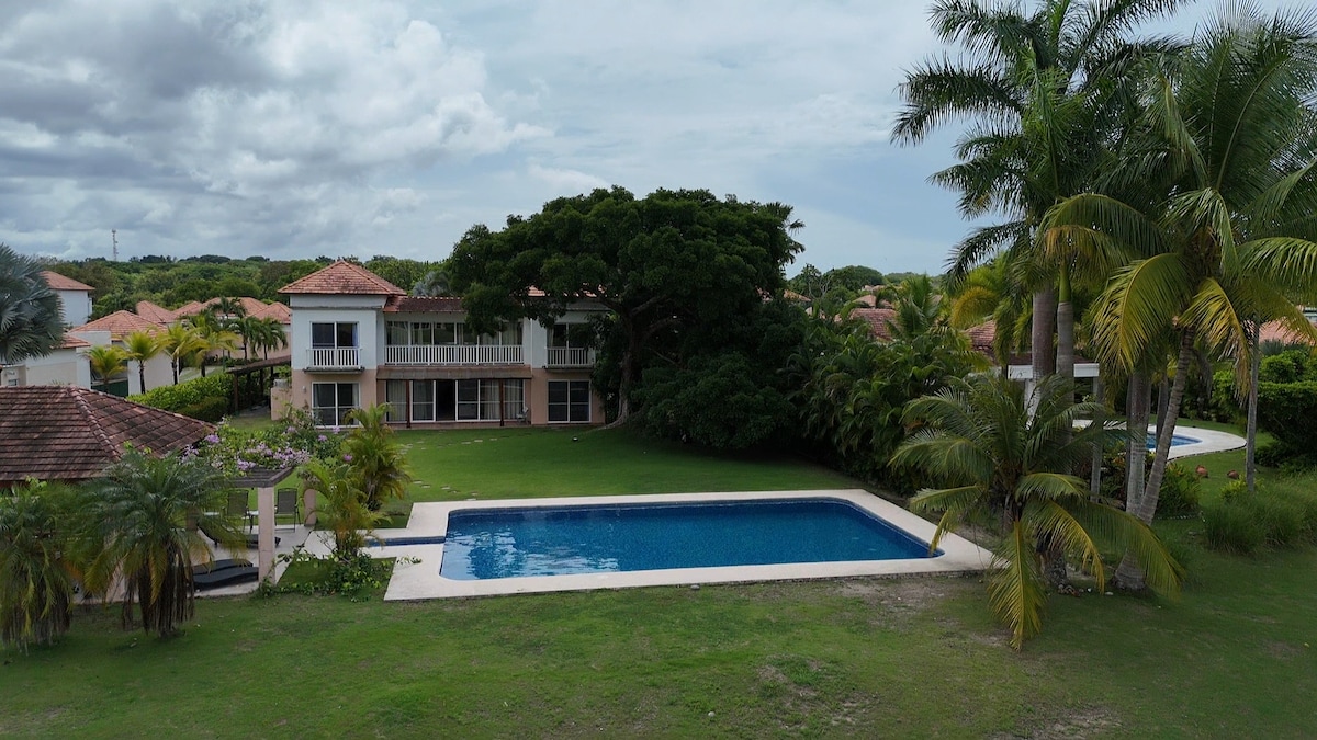 Spacious Villa with Pool, Golf Views & Beach Access Relax in this stylish 4-bedroom villa overlooking the 7th putting green of Mantarraya Golf Course. All on one level, it offers 250 sq m of comfort, with en-suite bathrooms and space for up to 12 guests. Wow ! - Private 15 m pool with shallow area - 15-minute walk to Pacific beach - Access to Owners Beach Club (restaurant + parking) - Peaceful golf course setting Perfect for families, groups, or golf lovers seeking sun and serenity.