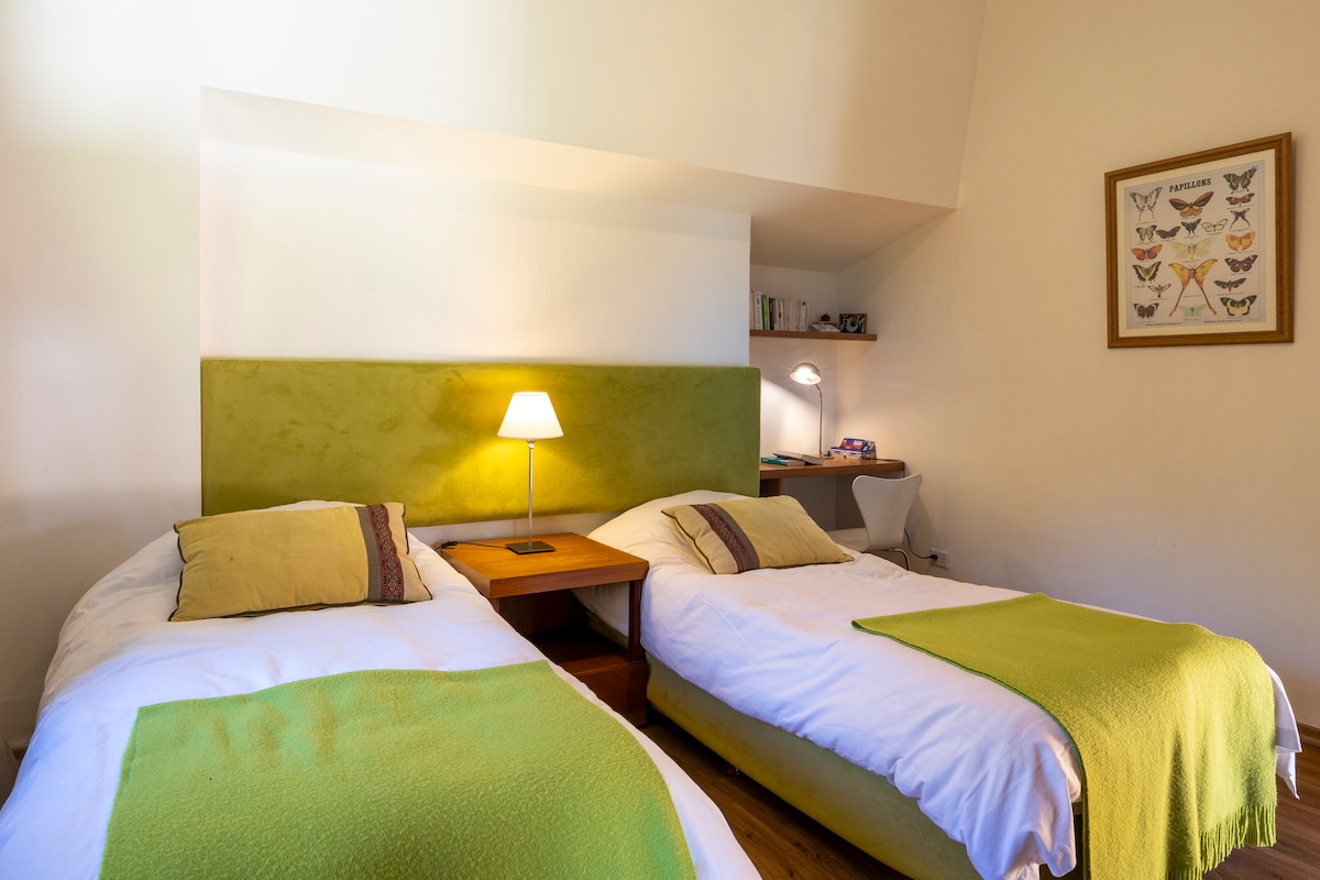 Have fun with the whole family in this stylish accommodation, surrounded by oak forest, fruit trees and Patagonian plants. Furniture in lenga and oak, large deck with living room set facing the park. Grill area. 4 bedrooms with King Koil sommiers. Queen beds. Custom cannon linen. Textile blackout curtains. Full kitchen with island in cohiue. Garage. Downtown area. Distributed on 3 floors, it gives privacy, capacity up to 8 passengers. 2 full bathrooms. 1 toilet.