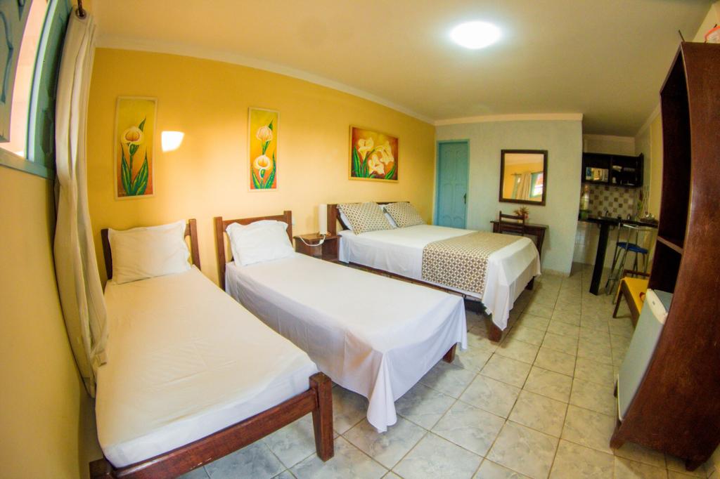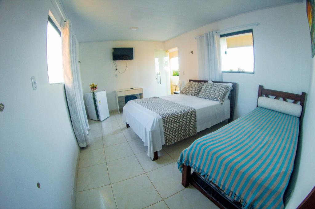 A triple room with a beautiful view of Campina beach, and a beach lagoon, queen bed with an extra bed available, or 3 single beds, en-suite with air-conditioning, and a full and stocked minibar; we count on a breakfast with several options of food available and included in the daily rate!