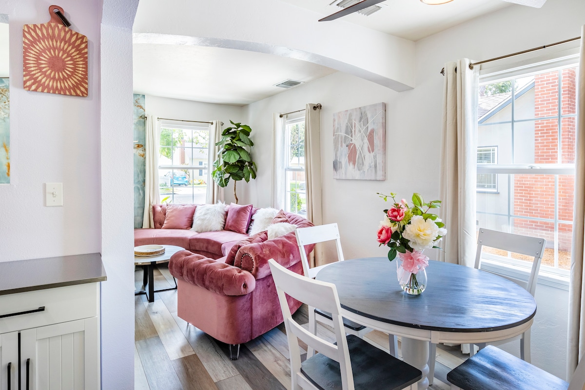 This light-filled house is located in a quiet neighborhood on the outskirts of Riverside and is central for visiting many Southern California attractions at an affordable price. The home has three bedrooms with 4 beds, and freshly decorated communal rooms with high ceilings and large windows including a large dining room, living room with games, breakfast nook, and a TV room. The large backyard offers beautiful sunsets in a setting surrounded by fruit trees, agave plants, and palm trees.