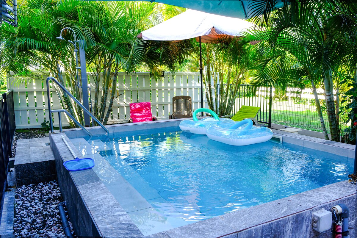 Welcome to our bungalow nestled in a peaceful and green setting, located 5 minutes from the airport and 10 minutes from the beautiful beaches. This cocoon includes an air-conditioned bedroom, bathroom, separate toilet and equipped kitchen. Relax by your pool with a floating tray, deckchairs, and a dining area. Located in the center to explore the north and south of the island, our bungalow is the perfect base for your tropical adventures.