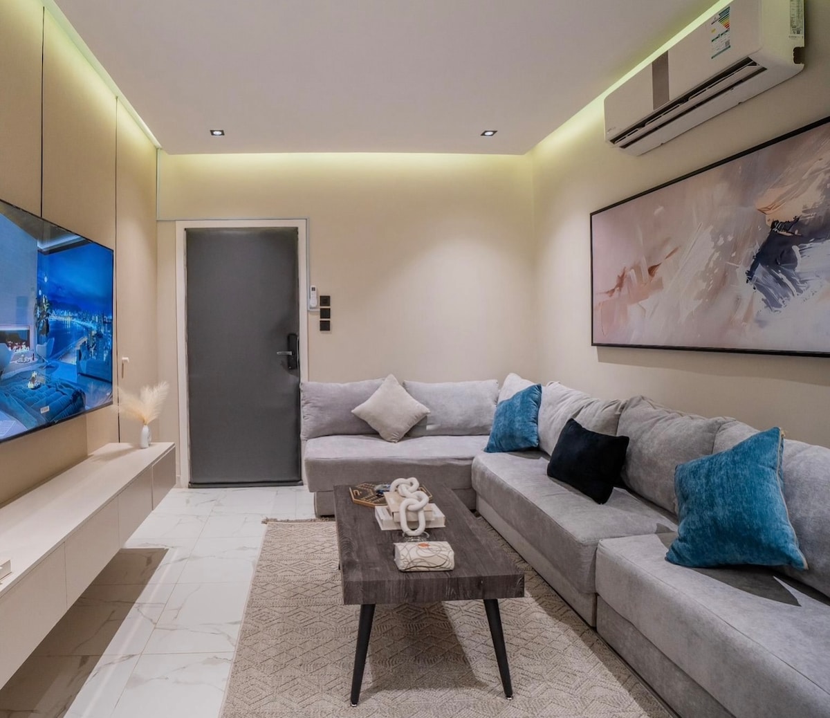 A stylish one-bedroom apartment with smart check-in, located in the heart of North Riyadh (Al Aqiq district). Perfectly situated close to the city’s most vibrant attractions and Riyadh Season events - Boulevard City - Winter Garden - Riyadh Park Mall - King Abdullah Financial District (KAFD) - Solitaire Mall - Diplomatic Quarter (DQ) 🛋️ Apartment Features: - Smart TV with subscriptions (Netflix, Shahid, YouTube) - Unlimited high-speed internet - Equipped kitchen(fridge, coffee machine, kettle)