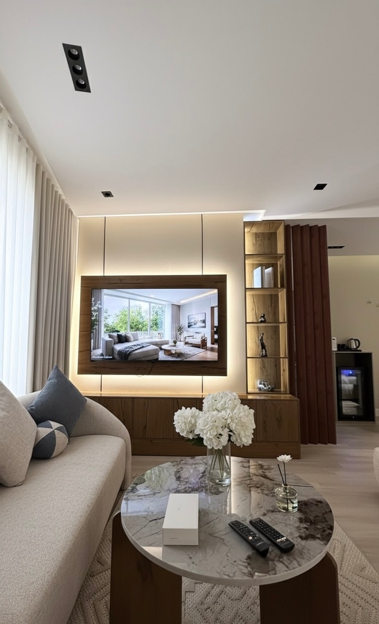 Cozy and luxurious apartment designed by Architect Khaled, located near Boulevard and close to the Financial Center (KAFD). Features a simulated fireplace that adds a warm and inviting ambiance. Includes a bedroom with a comfortable seating area, a stylish dressing room with a uniquely designed makeup vanity, and a spacious wardrobe. The apartment boasts a sophisticated and comfortable design, perfect for modern living.