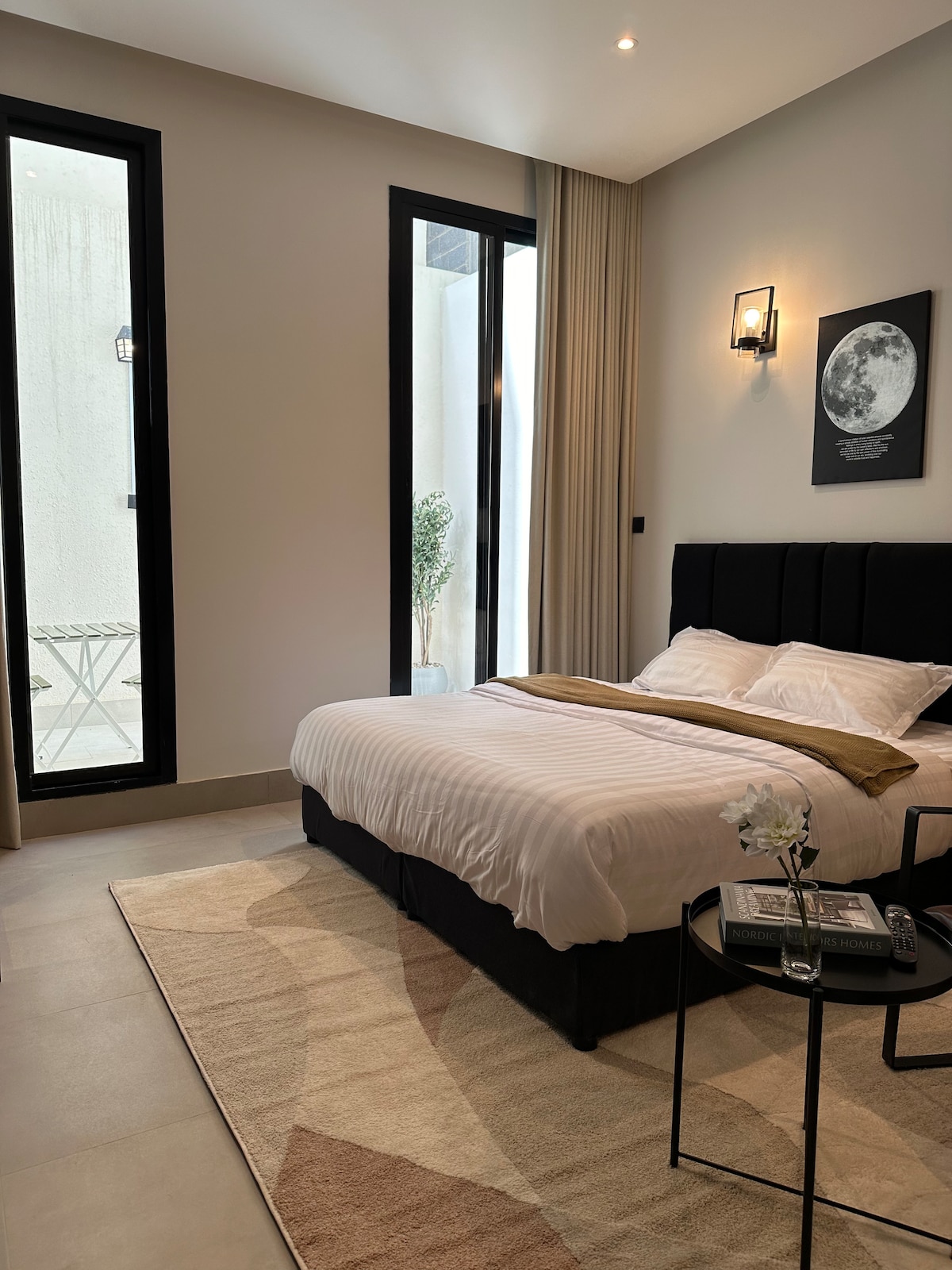 An elegant studio with complete privacy and smart self-entry with a unique design and a combination of comfortable colors and wonderful hotel services, it also features an outdoor seating with a beautiful view and a private barbecue corner that allows you to enjoy the outdoor courtyard, in addition to the presence of a small side kitchen that contains a refrigerator, kettle, microwave and surface oven, located in Al-Aqeeq neighborhood in a strategic location very close to Riyadh Boulevard, airport, restaurants and many nearby and distinctive event venues