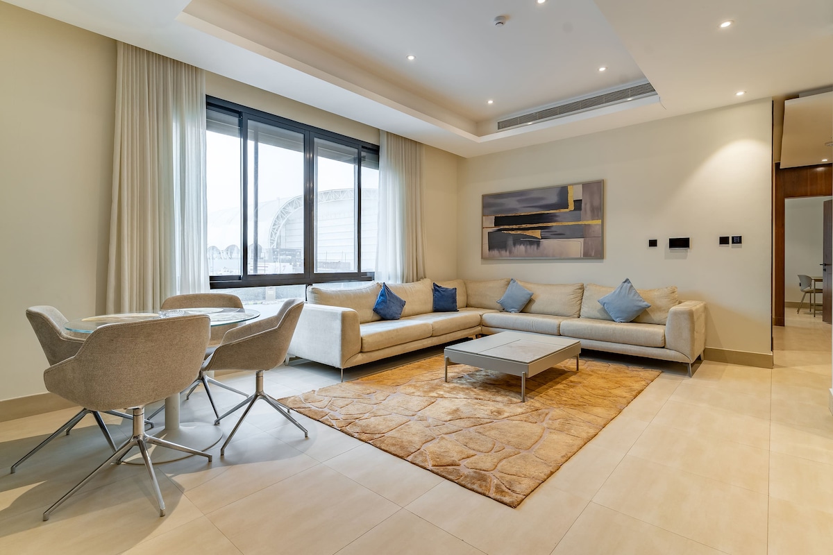 Attention to details: Luxurious Apartment, 5 minutes walking from Boulevard Riyadh City, next to Al Hilal Stadium (Kindom Arena), featured with: - Boulevard Riyadh City view. - One master room (king bed). - One bedroom (two queen beds). - Three bathrooms. - Wide living room with dining table. - Full kitchen. Maintaining high quality: - NADAV mattresses, bedspreads, and pillows. - Two Samsung smart TVs 65 inches. - Free unlimited (Wi-Fi). - Free washer. Wish you a pleasant stay ! 🌹