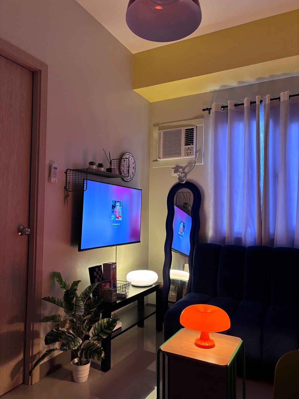 Have fun with the family in this bright & stylish place. 1) Squeaky clean, lofted 40sqm. 1BR 2) Clubhouse, pool, basketball court, open spaces 3) Professionally designed unit 4) 24hr security 5) condo VILLAGE w/ 15+low rise buildings 6) home amenities: coffee maker, rice cooker, oven toaster, fridge, TV, landline, Cable, WIFI, Airfryer, Microwave, Stove, heated shower, bidet, smoke al 7) well-lighted workspace/study 8) 2ACs, split &window 9) 2 beds(pullout) full double/single. NO QUEEN BEds