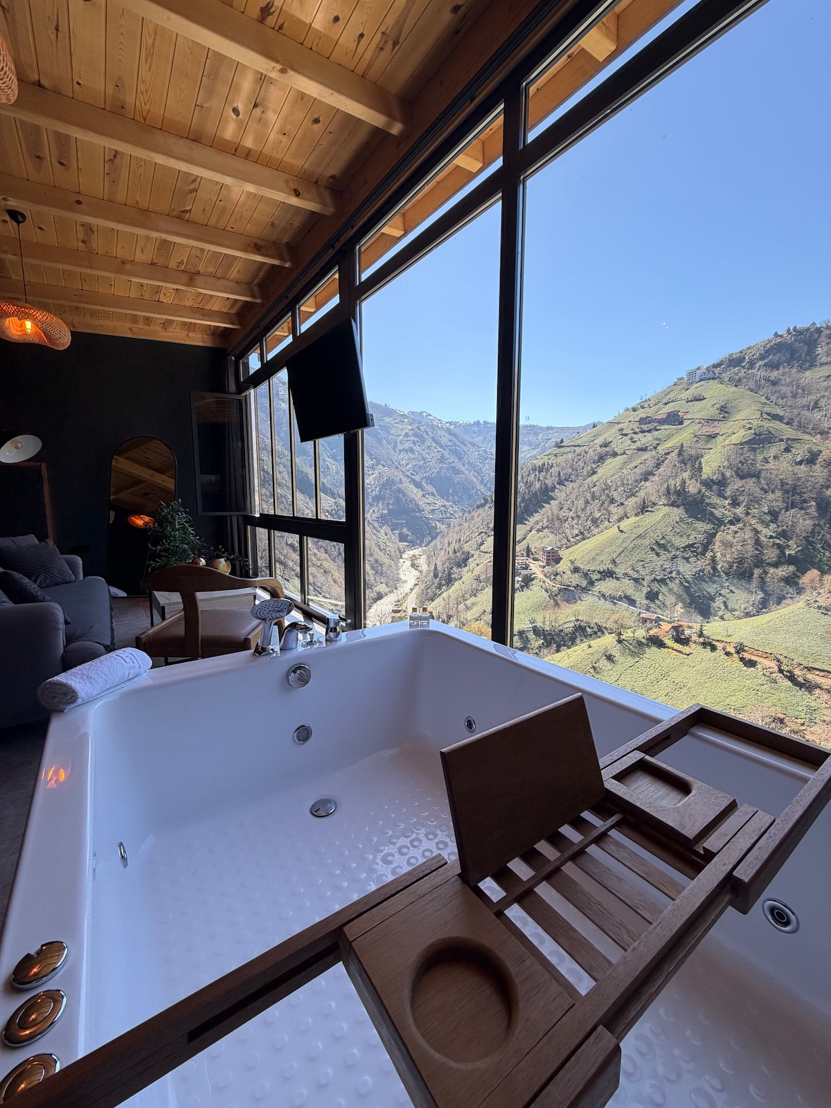 This private bungalow with a jacuzzi, which offers ease of transportation with its unique nature in Rize Ardeşen district, only 4 km from the sea and close to the airport, combines comfort and peace. Surrounded by the green nature of the Black Sea, the mansion is located in a central but also quiet spot, ideal for those who want to be close to city life and those who want to be alone with nature. We offer a spacious and peaceful environment with a large terrace with panoramic views and wooden details in the interior