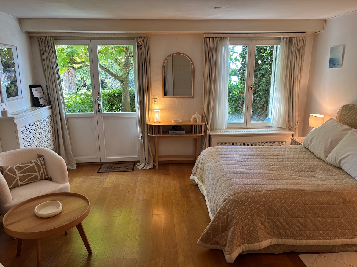 This peaceful accommodation offers a relaxing stay for a small family or couple. Located in a lovely residential area, 2 steps from the lake and the Villeneuve swimming pool. This small, comfortable 33 m2 studio offers a separate entrance through a small, landscaped, shaded courtyard. It offers a kitchenette, shower room, sitting/dining area, queen size bed and storage cabinet. Bus stop 2 minutes away, reach Montreux in 10 minutes, Château de Chillon in 5. Travel cot available.