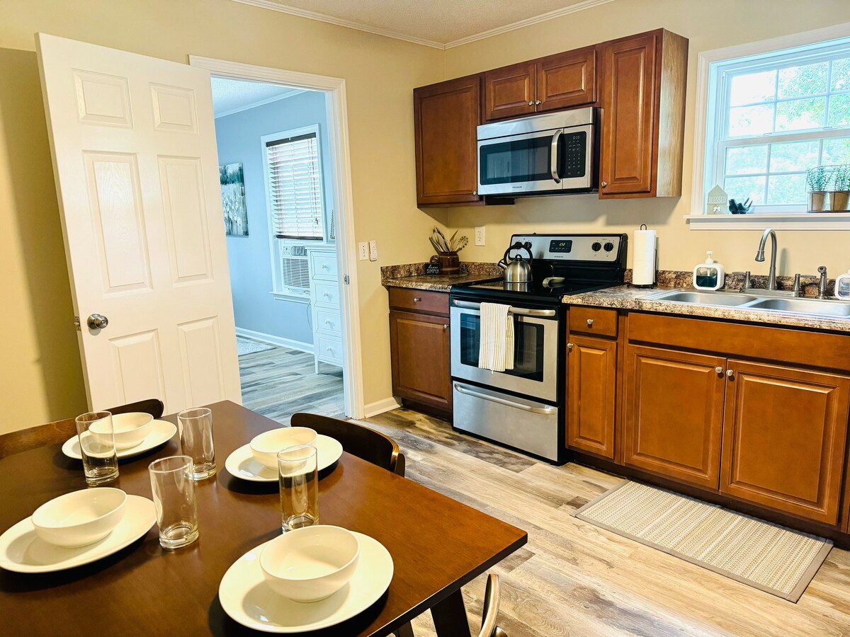 Escape to “Simplicity,” a serene private studio apartment and true home-away-from-home. Queen bed + queen sleeper sofa, vanity/work areas, and a full kitchen. Tucked behind our main house with covered parking—perfect for rainy South GA days—on the quiet outskirts of town. Drive times (approx.): • Statesboro/GSU: ~30 min • Pembroke, Metter, Reidsville, Glennville: ~25 min or less • Savannah & Hinesville: ~1 hour