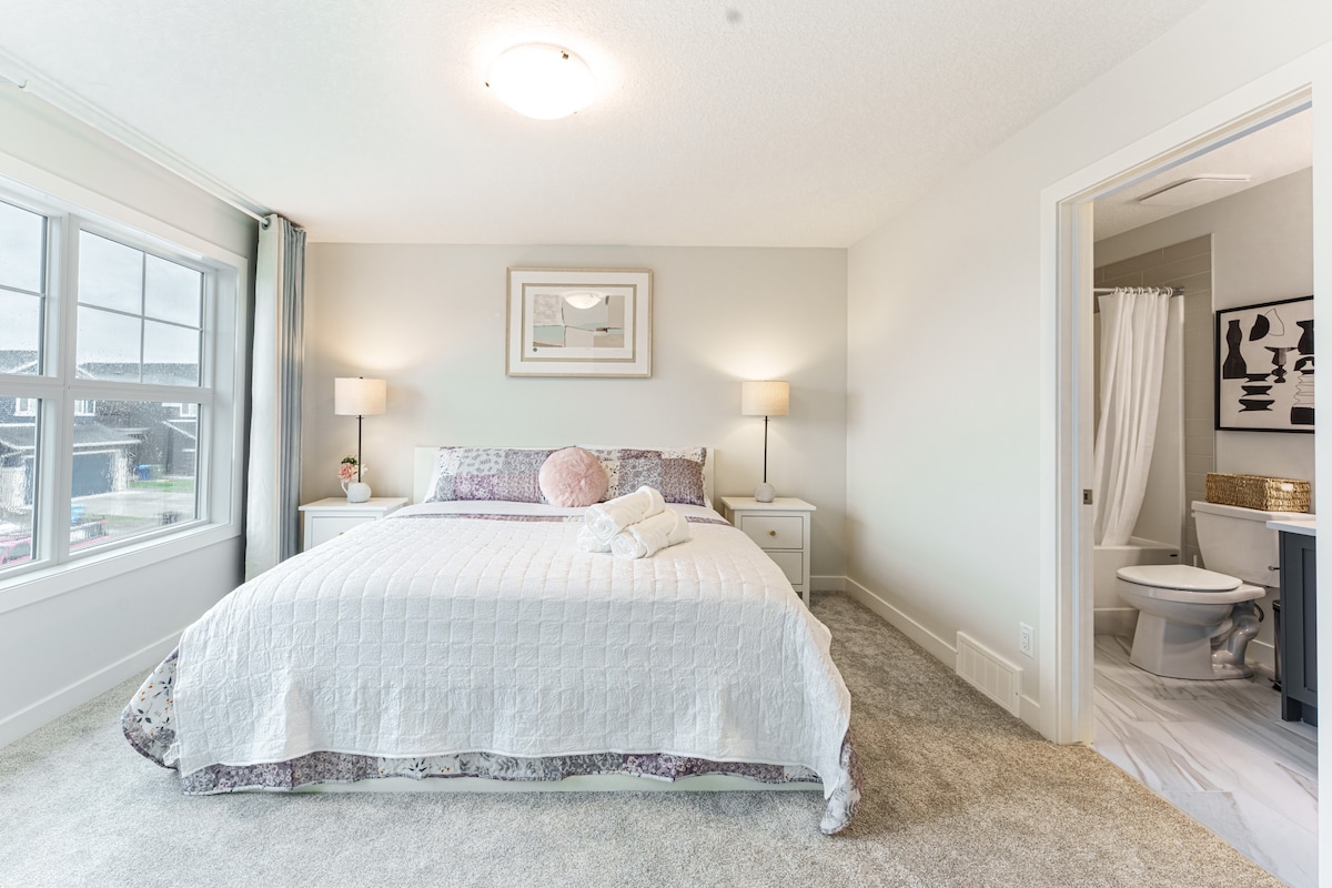 Escape to our modern 2600 sq. ft. Chestermere home, perfect for up to 8 guests! This 3-story retreat features 3 bedrooms (2 King, 1 Queen), an indoor fireplace, outdoor firepit, and two living rooms. Enjoy peaceful lakeside living just minutes from Chestermere Lake and a short drive to Calgary. Ideal for families and large groups seeking a spacious and comfortable getaway with top amenities like a game table, gym, weights and BBQ.