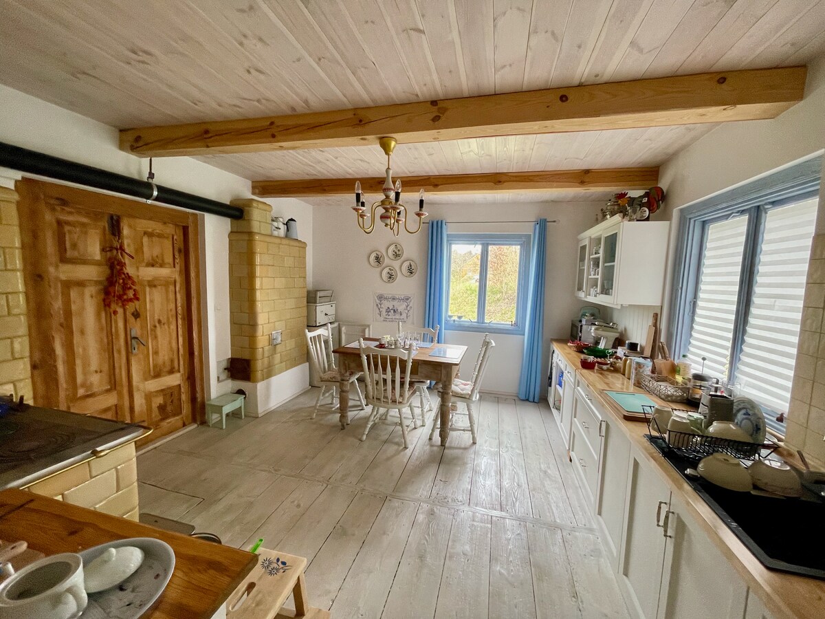 The surroundings provide extraordinary silence and picturesque areas with numerous unused paths connected to meadows and forests. The interior includes 2 tiled stoves. We offer up to 12 beds in four cozy rooms. There is a separate bathroom on both floors. The ground floor of the house includes a kitchen, dining room and three rooms for 6-8 people. Upstairs there is a large space for 4-6 people.