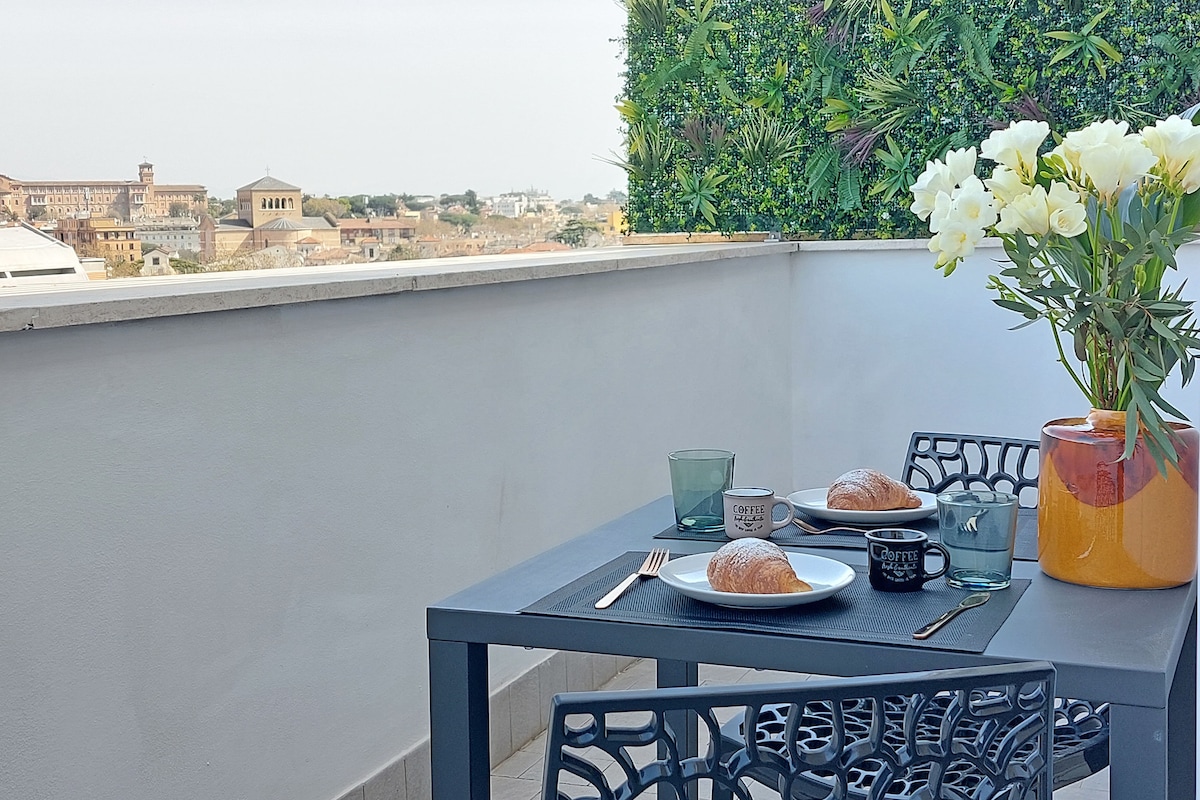 Bright and quiet penthouse apartment in the heart of Trastevere, with a wonderful terrace and an unparalleled view of charming roman roofs and the Gianicolo hill. The flat is meticulously refurbished and set in a picturesque cobblestoned street, just around the corner from the lively restaurants and cafes. La Casetta al Mattonato is located on the 3rd floor (41 steps, no elevator) of a 1600s typical roman building, within walking distance of all major attractions.