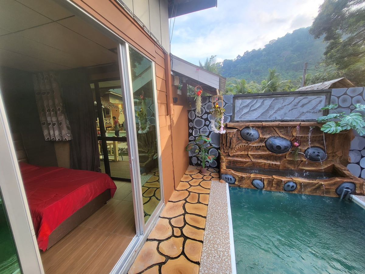 Our guest suite is located in Kampung Juara on Tioman Island. Situated at the hillside on the northern side of Juara bay - with an amazing view of the whole bay - it's surrounded by pristine rainforest and beautiful nature. Peaceful and private area with a river separating the property from the common beach area. At high tide the river can be crossed with one of our shared kayaks - or just by wading through the water - and during low tide it's easy to walk in and out of the property.