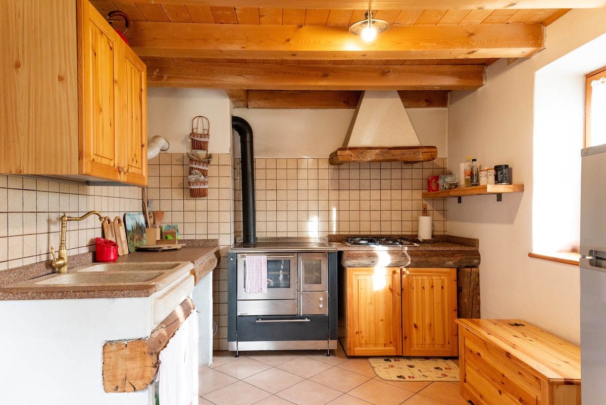 The Essence apartment is an open space with a double bed, a bathroom with a bathtub and shower, an equipped kitchen, a large balcony, and a veranda overlooking the house's garden. The wooden floor and the wood stove in the center of the living area convey the warmth of the environment. A cozy and intimate atmosphere for a relaxing and rejuvenating stay.