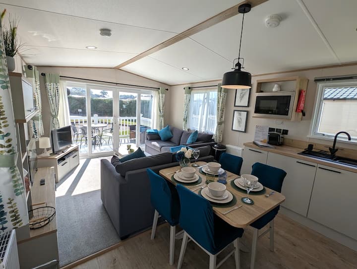 high-quality fixtures and fittings that exceed typical holiday home standards, ensuring a comfortable and memorable stay. The main entrance opens into a welcoming open-plan lounge, dining area, and kitchen, filled with a cheerful holiday vibe.