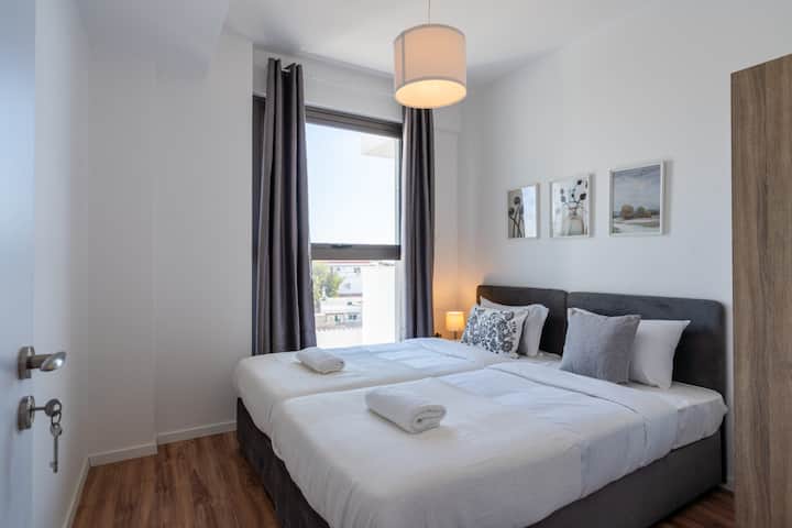 The main bedroom features a soft double bed dressed in clean white linens, accented with soothing textures and subtle hues. Blackout shades and air conditioning ensure a peaceful night’s sleep, even during the warmest Cypriot nights. The space is simple, modern, and serene—perfect for rest and renewal.