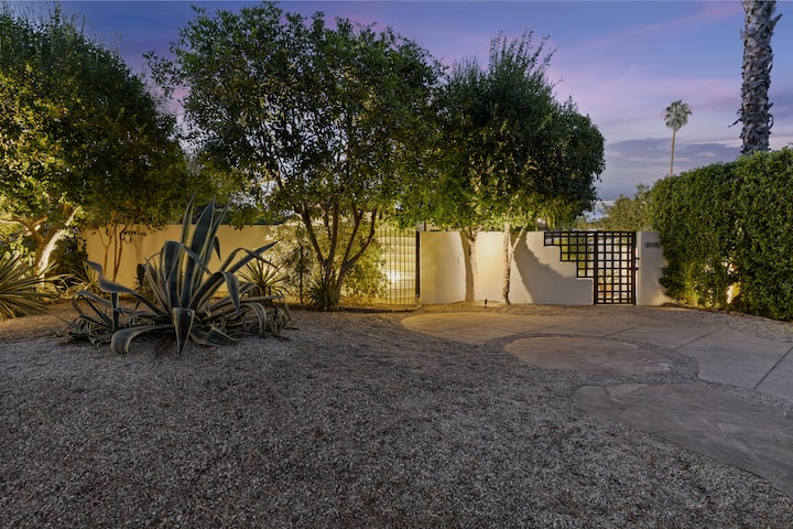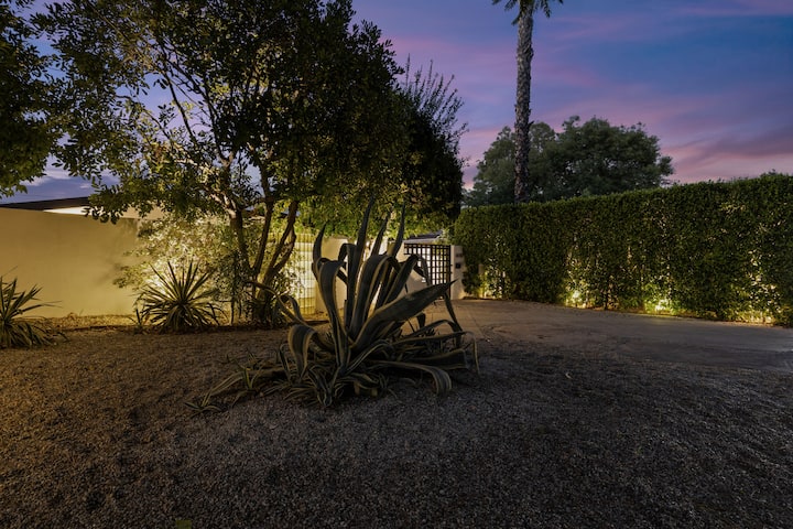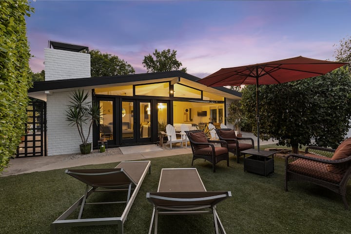 The "Glass House," a meticulously designed Mid Century Modern located south of the blvd, offers proximity to Beverly Hills, Malibu, and Hollywood. A gated entrance ensures seclusion. Floor-to-ceiling windows integrate indoor & outdoor living, opening onto several distinct outdoor spaces, including Adirondack chairs and modern furniture. Architectural details feature pops of color, a brick fireplace and a backyard landscaped in a classic desert aesthetic—an exquisite fusion of style and function.