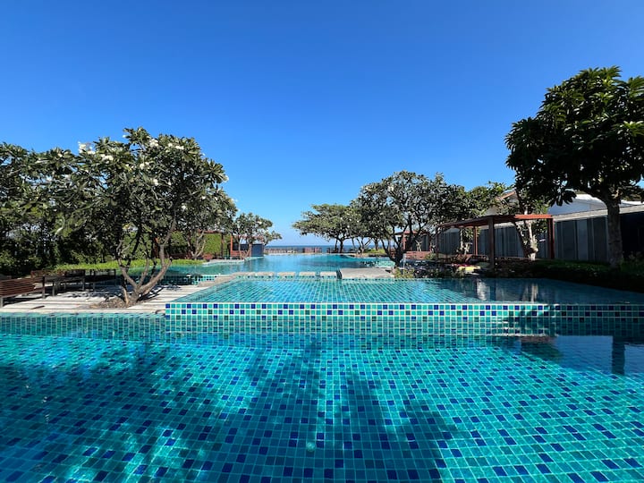 The condominium offers a large adult swimming pool and a children's pool located by the sea, with direct access to the beach. It is a beachfront property with beach chairs and sea-view lounging areas. *Free parking for one car, please inform in advance.
